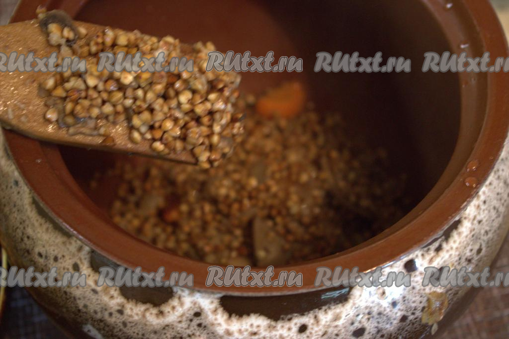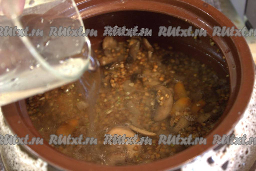 В каждый горшочек влить кипящую воду так, чтобы она была на 2 сантиметра выше уровня гречки с овощами и грибами.