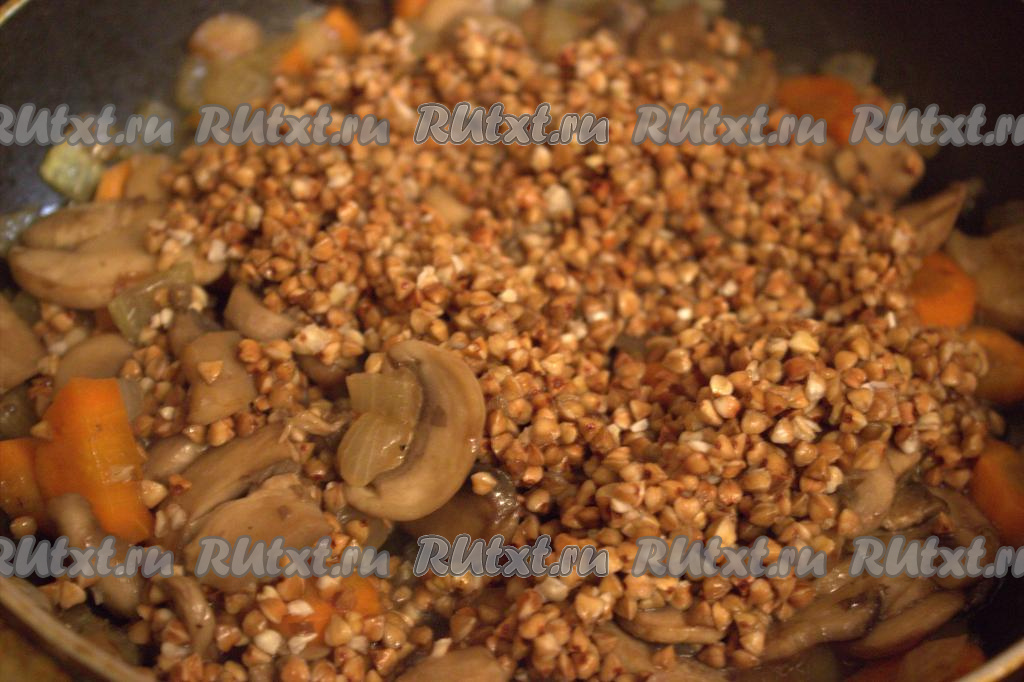 Добавить промытую гречку в сковороду к овощам и шампиньонам, перемешать, приправить специями по вашему вкусу, посолить и обжаривать минут 5, не забывая помешивать.