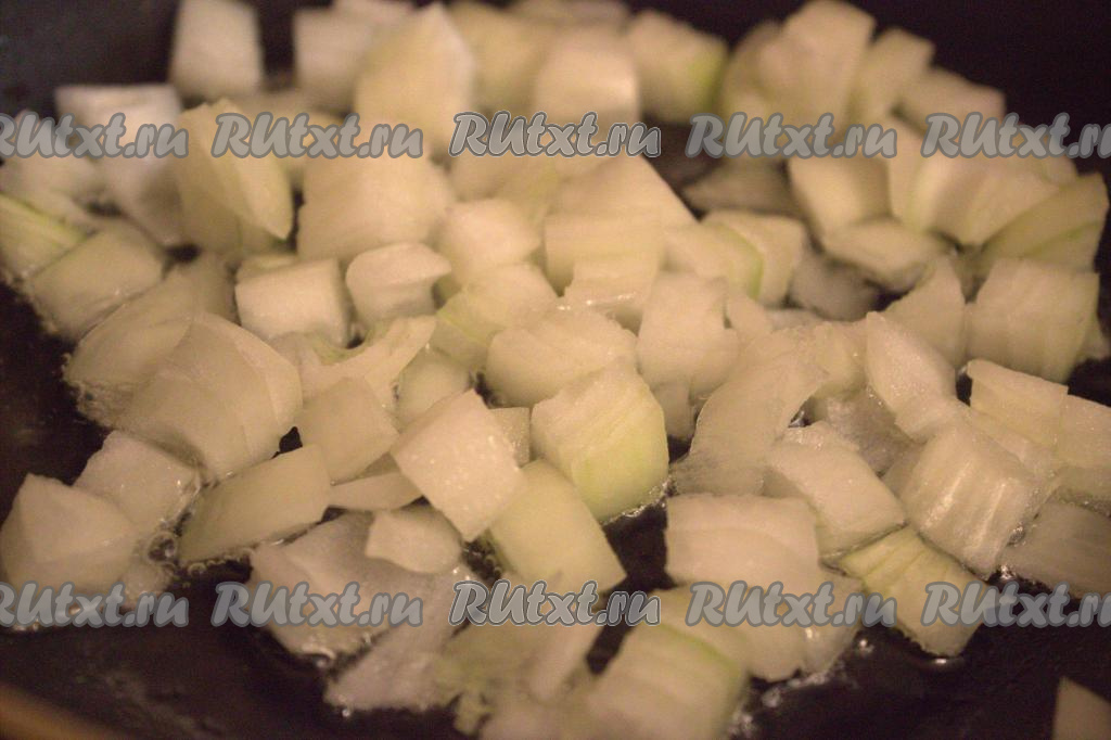 В сковороду влить растительное масло, разогреть на среднем огне, а затем выложить нарезанный лук и обжарить, помешивая, в течение 1-2 минут.