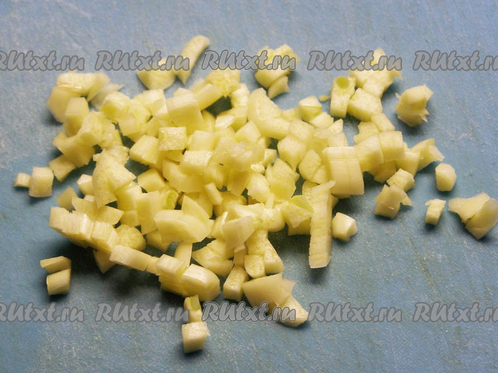Измельчаем чеснок. Если пропустить чеснок через пресс, он может пригореть, поэтому лучше нарезать его ножом на маленькие кубики.