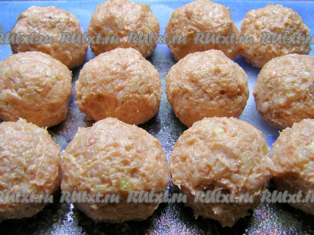 Чтобы фарш не прилипал к рукам, смачиваем руки водой и из приготовленного фарша влажными руками формируем круглые тефтели диаметром, примерно, 5 см.