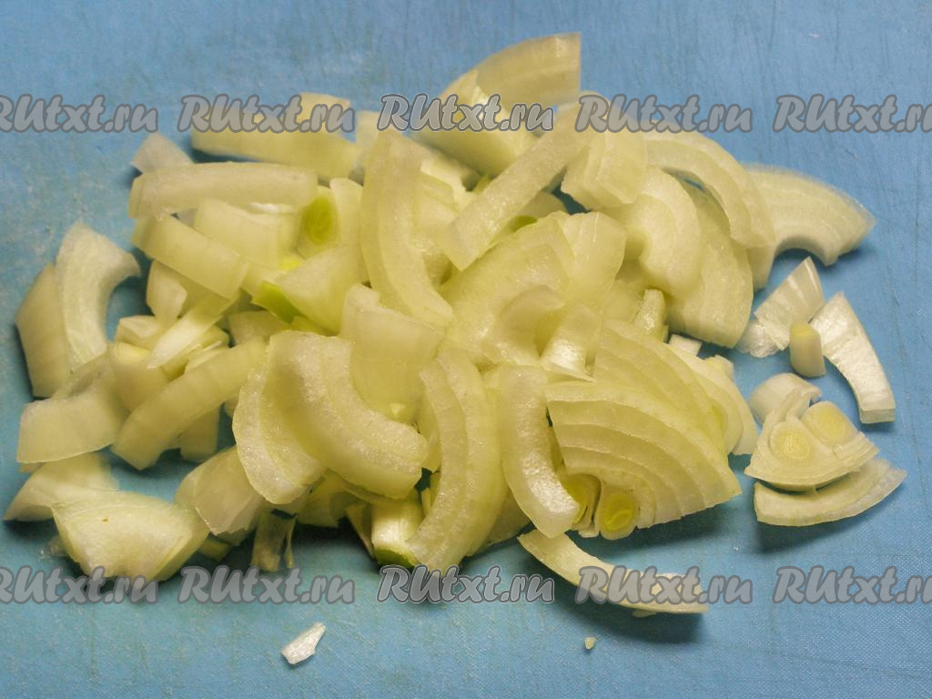 Для приготовления сметанного соуса луковицу очищаем и нарезаем на полукольца.