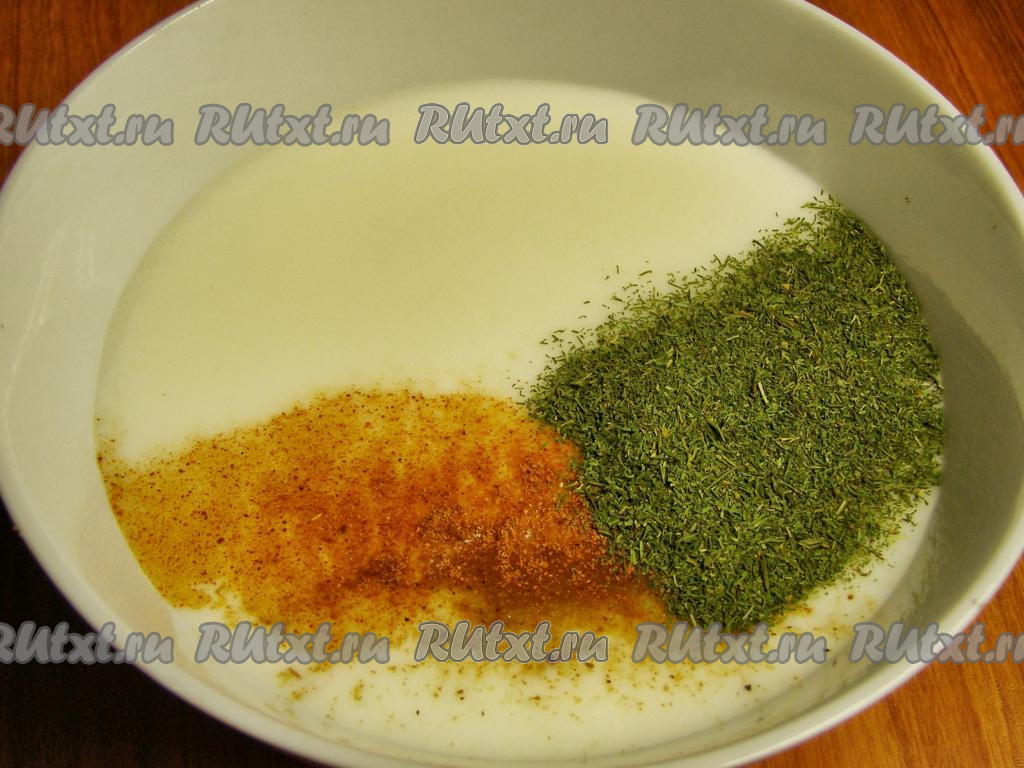 В сметану добавляем соль (я использовала адыгейскую соль), красный молотый перец (по желанию) и сушёный укроп, вливаем холодную кипячёную воду и перемешиваем сметанный соус.