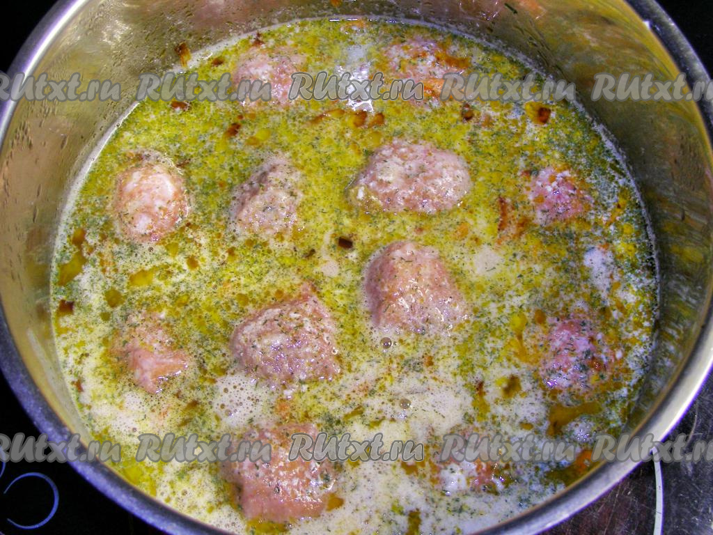 Заливаем тефтели сметанным соусом. Соус должен полностью покрывать тефтели. Если это не так, добавляем ещё воду и солим по вкусу. На сильном огне доводим до кипения, затем огонь уменьшаем до среднего и тушим, примерно, 15 минут, накрыв кастрюлю крышкой.