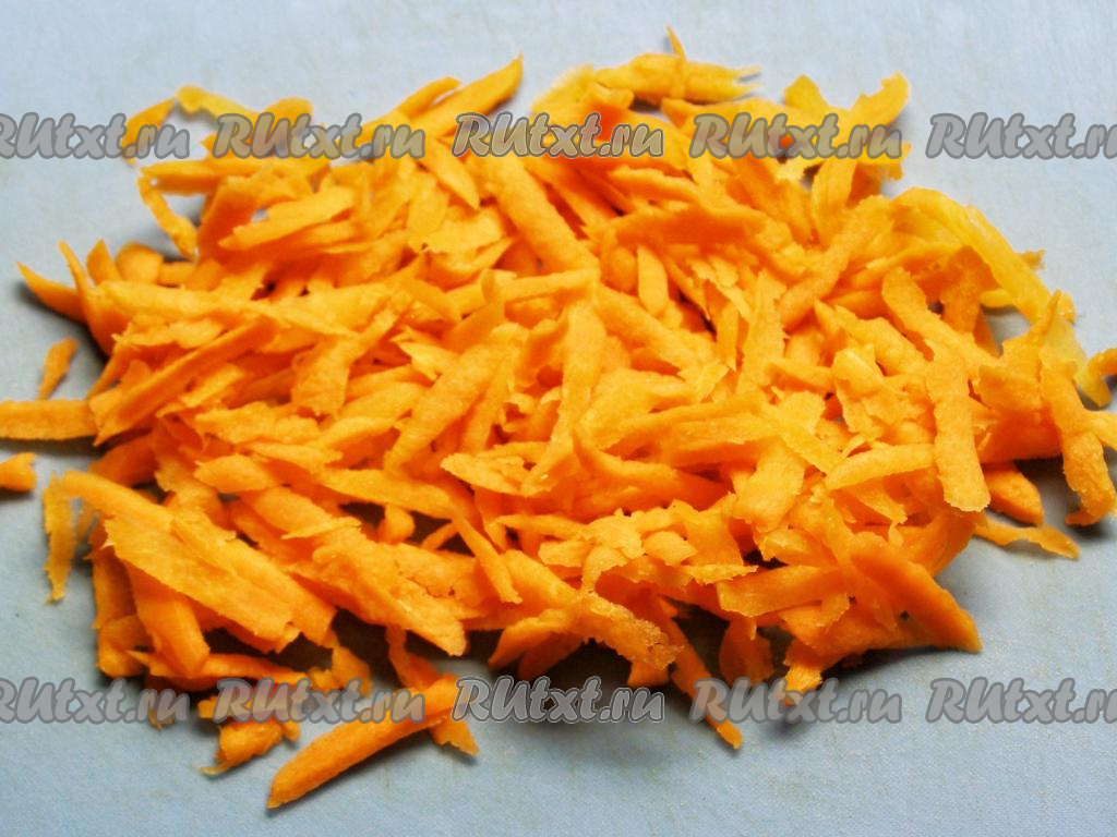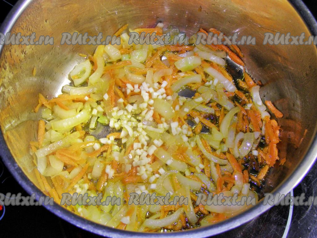 В кастрюлю наливаем подсолнечное масло (примерно, 1 столовую ложку), на среднем огне обжариваем лук и морковь. Когда овощи станут мягкими, добавляем чеснок, перемешиваем и обжариваем ещё около минуты.