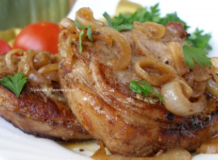 Готовое блюдо достать из духовки. Свиные стейки, замаринованные в соевом соусе, можно подать вместе с луком, с которым запекалось мясо.