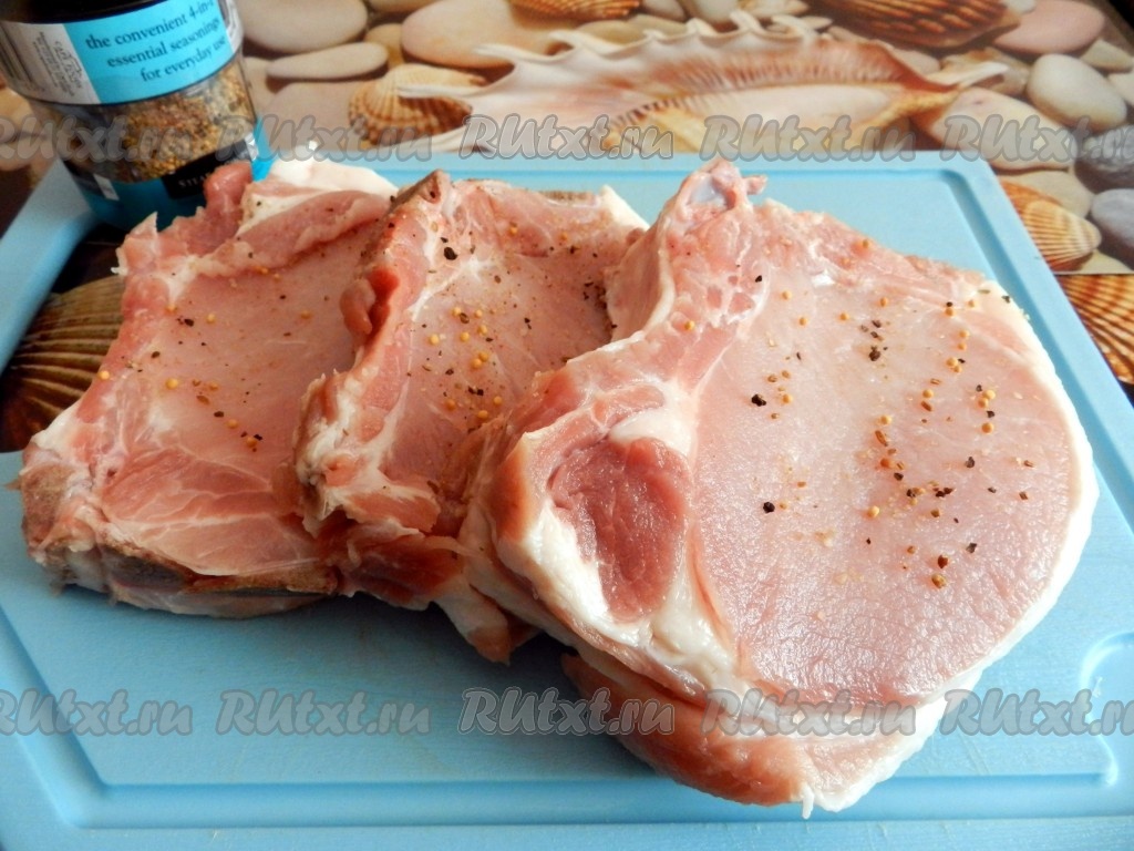 Свиные стейки вымыть, обсушить, натереть специями (я использовала специи для мяса).