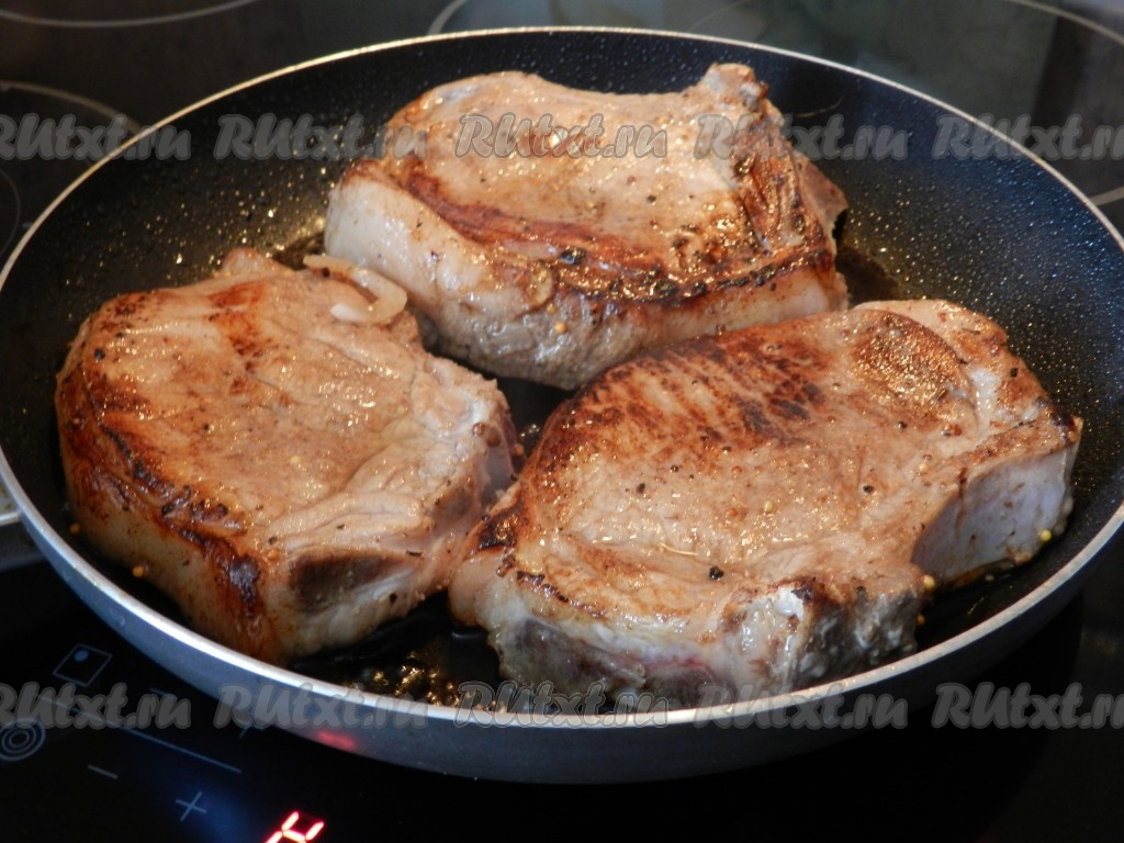 В сковороде разогреть растительное масло, затем выложить стейки, обжарить их до румяной корочки с обеих сторон на огне выше среднего. Не нужно жарить свинину до готовности, нужно только чтобы образовалась корочка на мясе, доводить до готовности мясо будем в духовке.