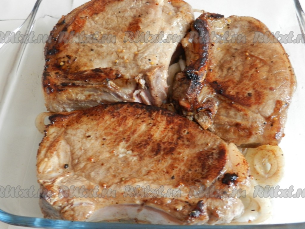 Духовку нагреть до 200 градусов. В форму для запекания выложить лук, с которым мариновалось мясо. Поверх лука разложить в один слой обжаренные свиные стейки. Поставить в разогретую духовку. Запекать мясо 20-30 минут при температуре 200 градусов.