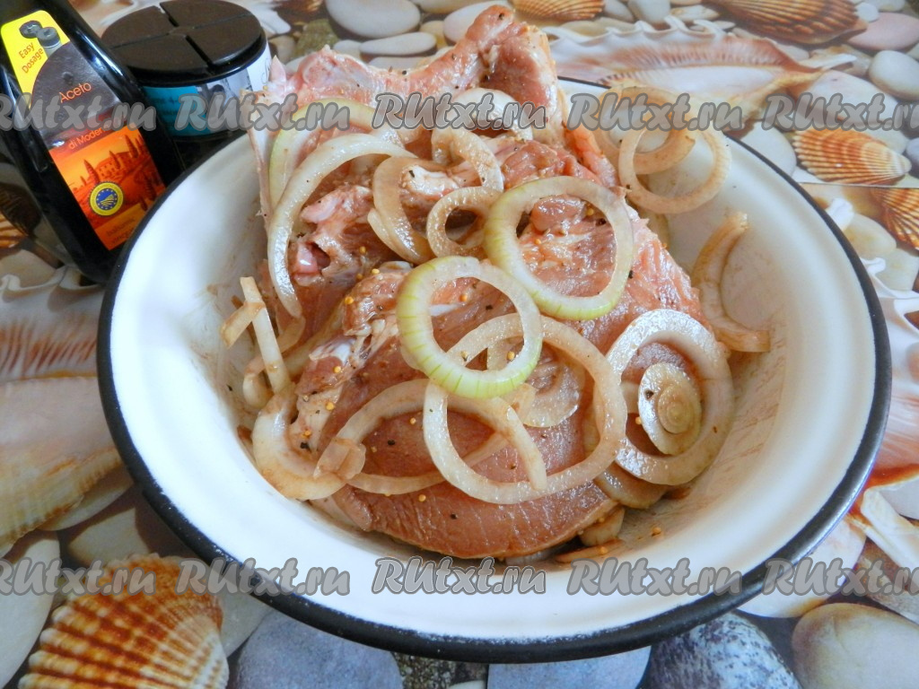 Сложить свиные стейки и лук в миску, добавить соевый уксус, перемешать, покрывая мясо соусом со всех сторон, и оставить на 1 час мариноваться в прохладном месте. В течение этого времени можно 2-3 раза мясо перевернуть, чтобы оно равномерно пропиталось соусом.