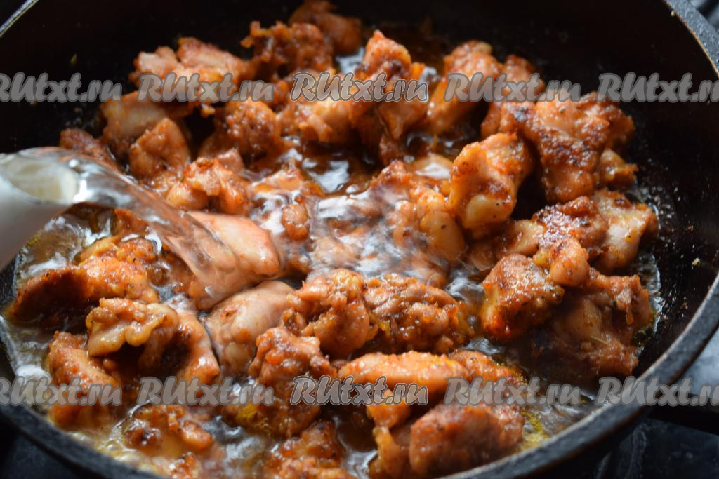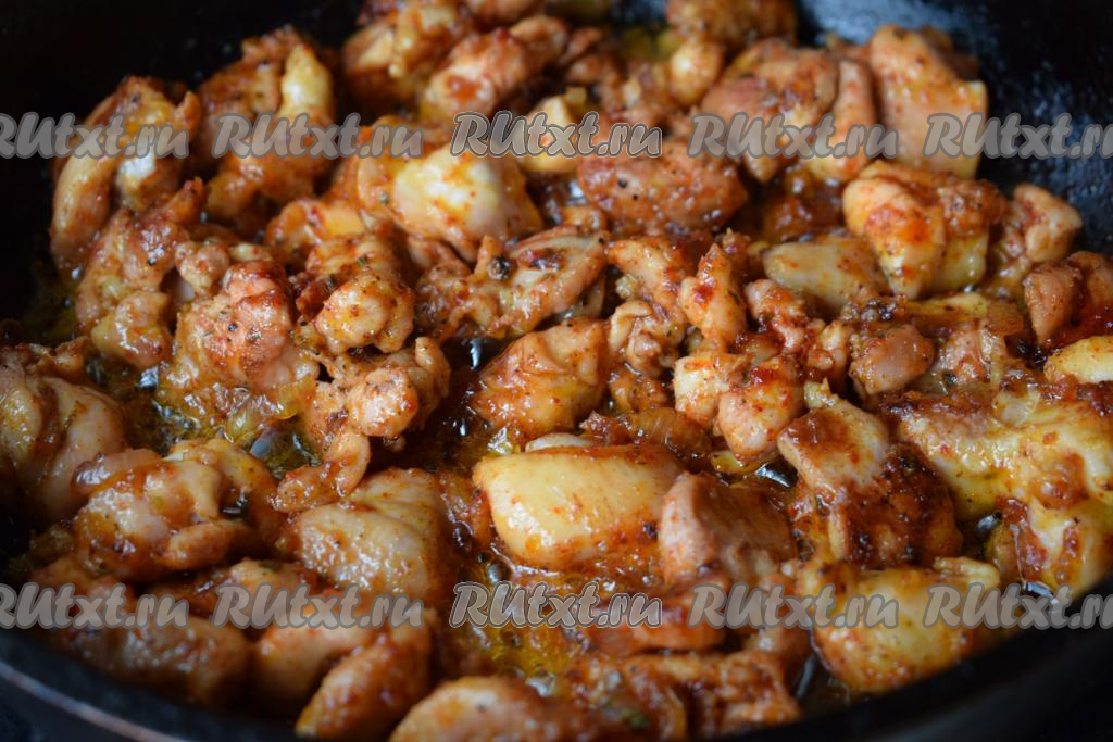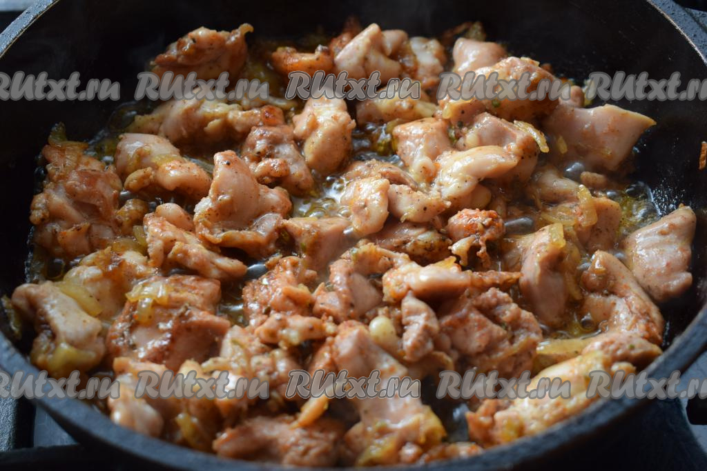 Обжариваем куриные кусочки вместе с луком, периодически помешивая содержимое сковороды, на среднем огне в течение 15-18 минут.
