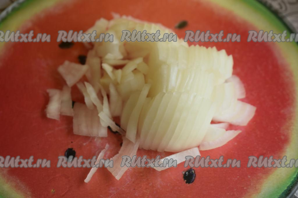 В это время очистим луковицу и нарежем её на четверть кольца (или полукольца).