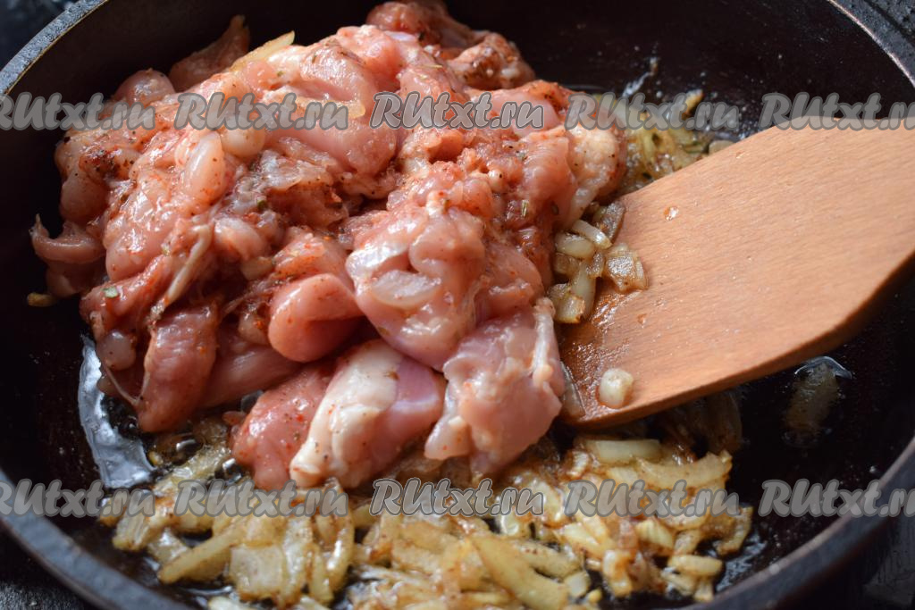 К обжаренному луку добавляем кусочки курицы.