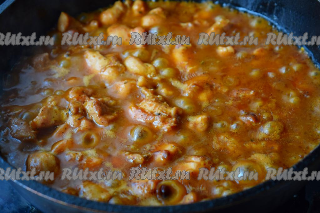 Наша подлива из курицы будет томиться и на её поверхности будут образовываться крупные пузыри, перемешиваем её пару раз, чтобы мука не пригорела ко дну сковороды.