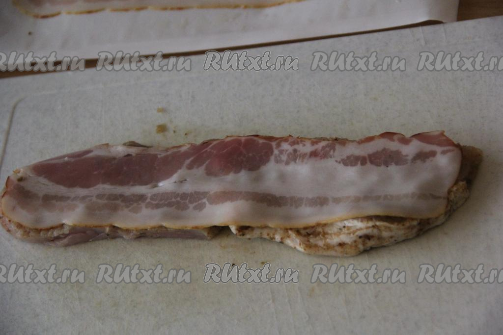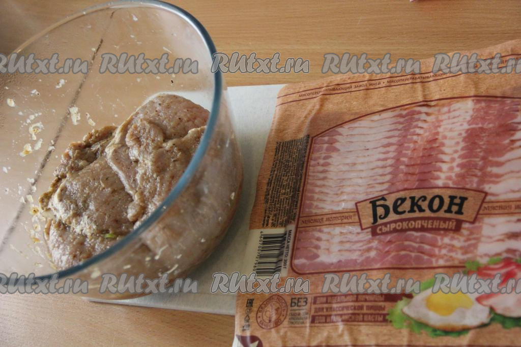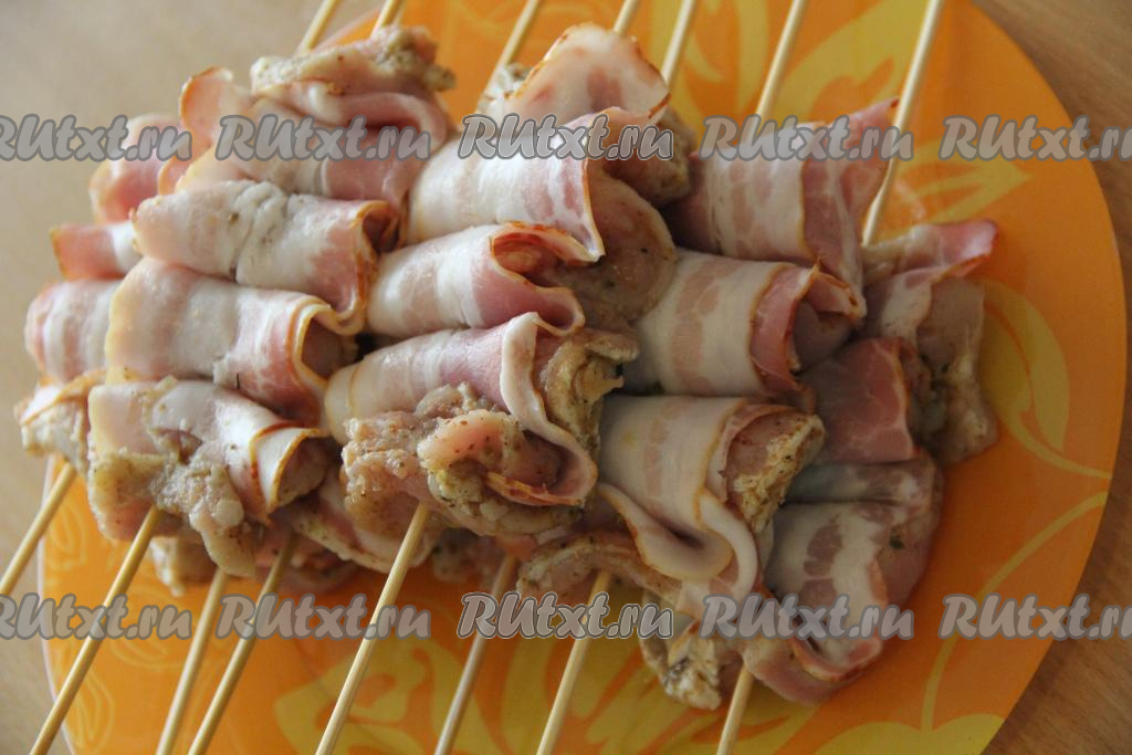 Вот так выглядит заготовка свинины с беконом на шпажке.