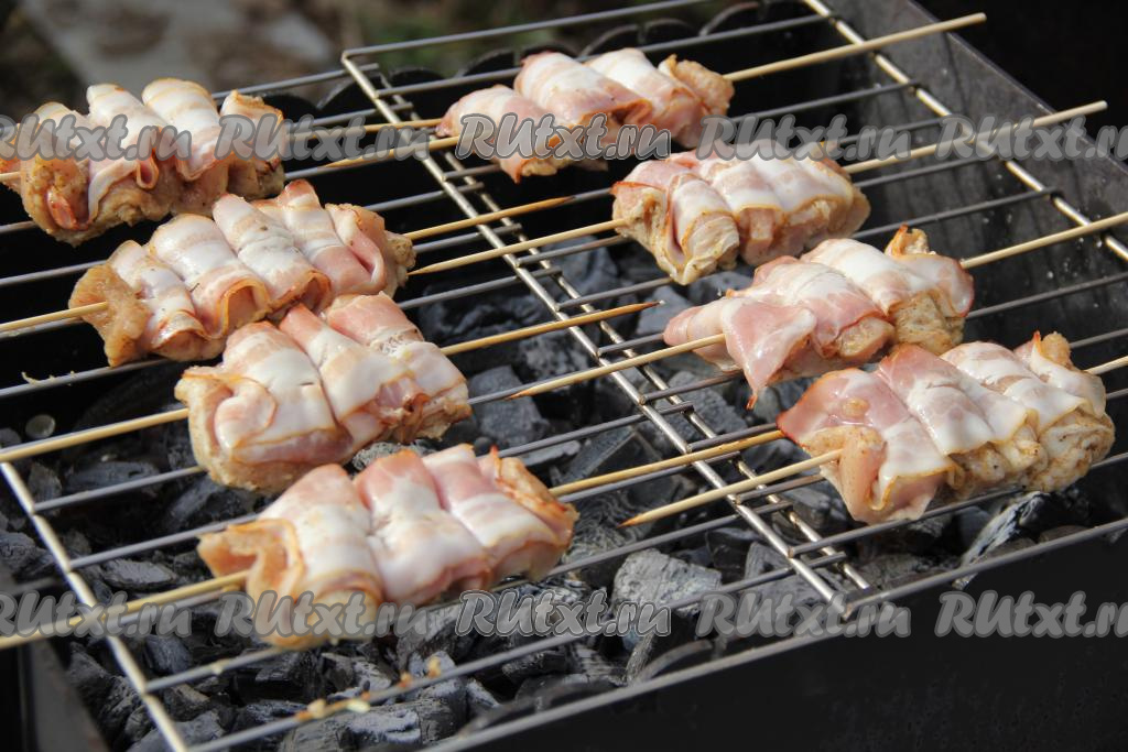 Подготовить мангал с углями. Раскалить угли, но следите, чтобы не было открытого огня! Выложить свинину с беконом на шпажках на решётку.
