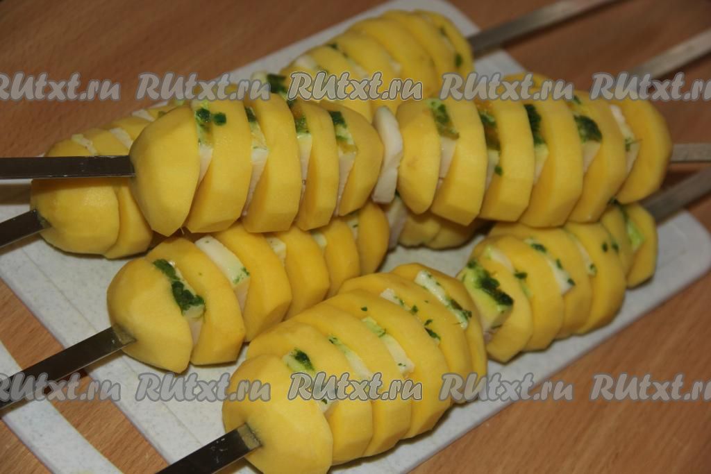 На шампуры надеть кружочки картофеля, чередуя с салом.