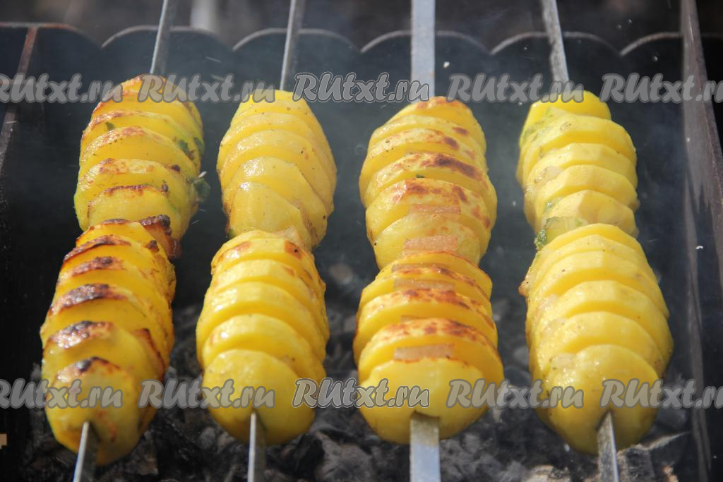 Выложить завёрнутые шампуры с картофелем и салом на мангал с раскалёнными углями и готовить, примерно, 30 минут, периодически переворачивая.