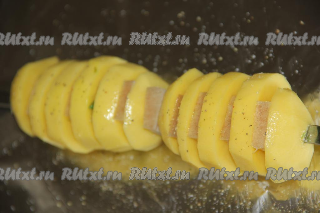Аппетитный, очень вкусный, ароматный картофель с салом, приготовленный на шампурах, подать к столу с пылу с жару.