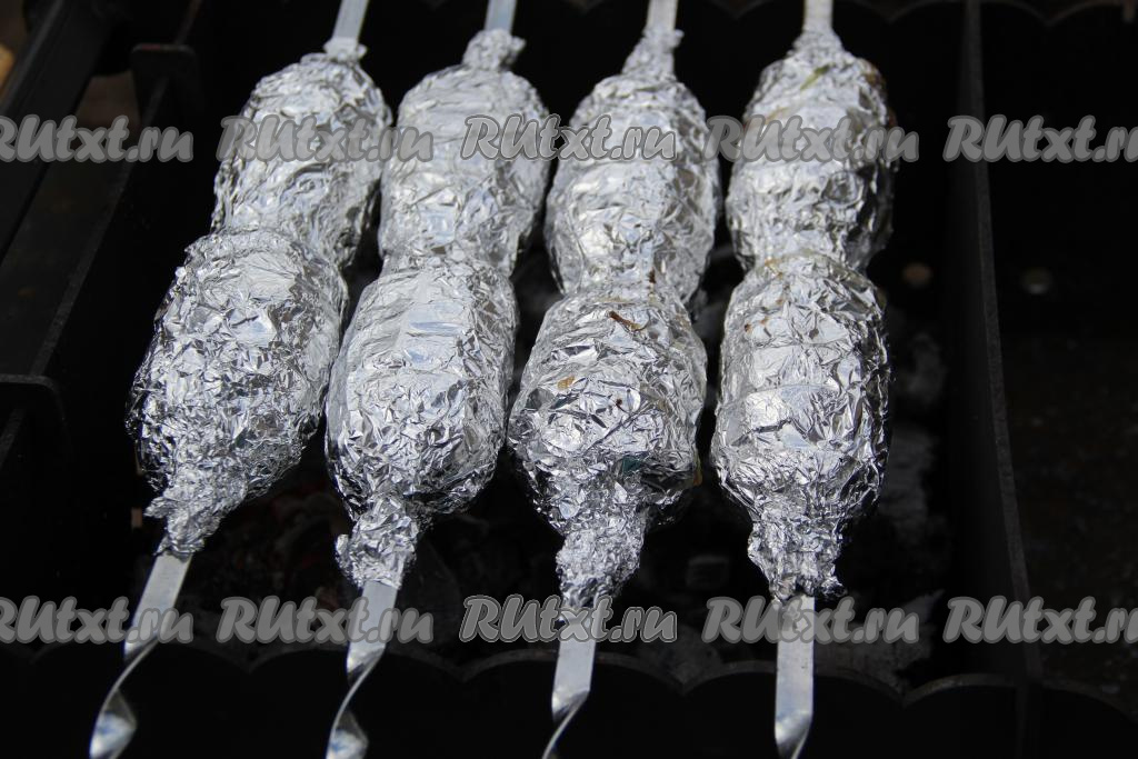 Плотно завернуть шампур с картофелем и салом в фольгу. Завернуть в фольгу оставшиеся шампуры.