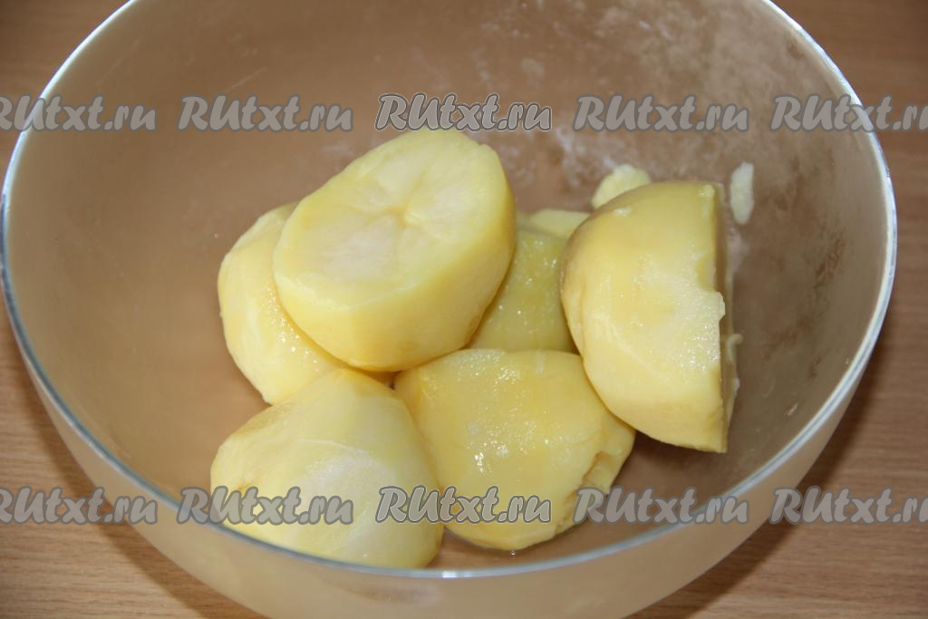 Очищенный картофель, отваренный заранее, (можно и специально для этого блюда отварить очищенную картошку в течение 20-25 минут с момента закипания) выложить в глубокую миску.