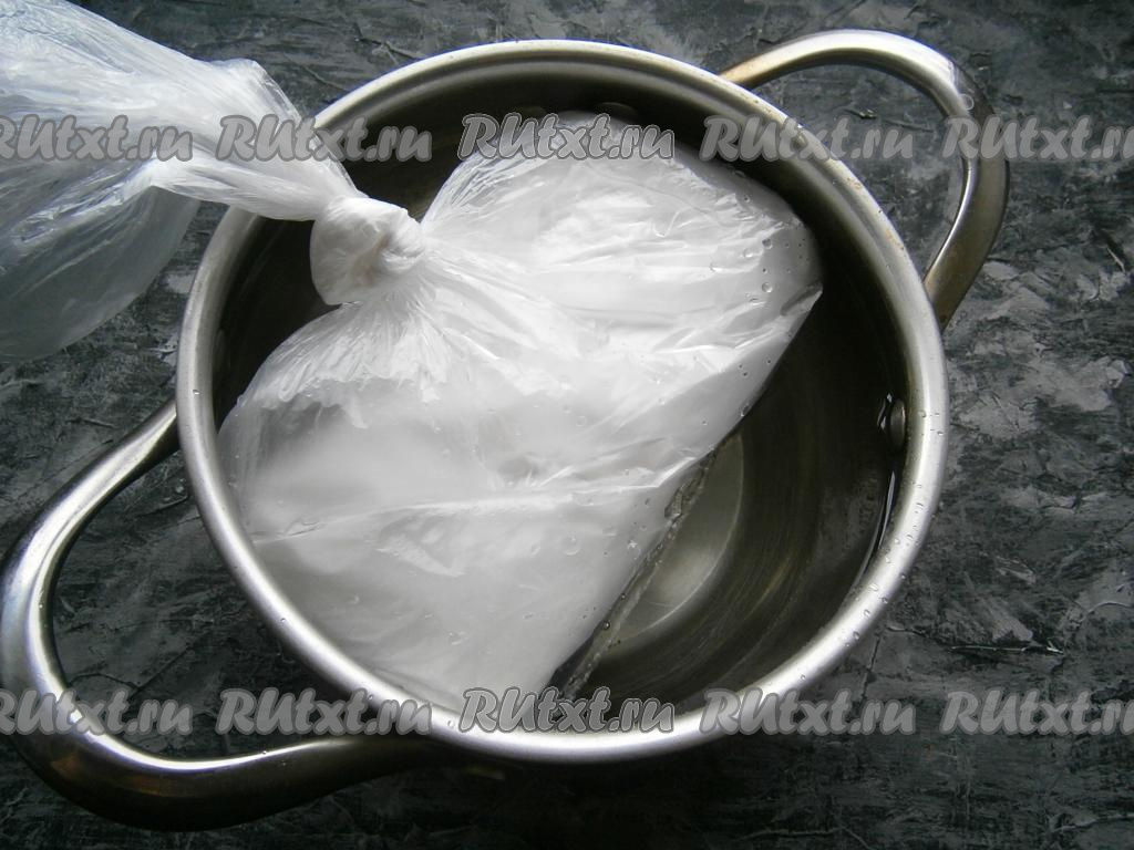 В кастрюлю налить холодную воду и выложить в неё пакет с салом. Воды должно быть столько, чтобы сало плавало в ней и при погружении вода его покрывала полностью.