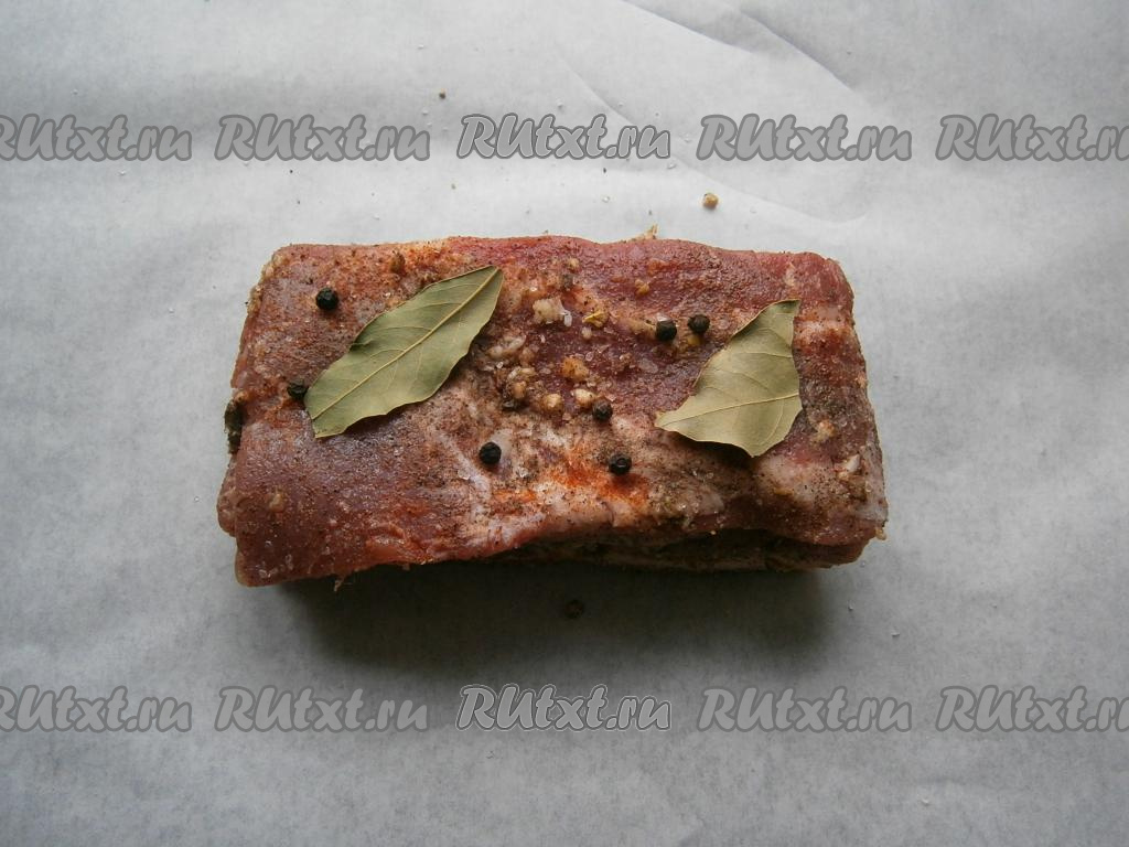 Сало поместить на лист пергамента, сверху разместить лавровые листья и чёрный перец горошком.