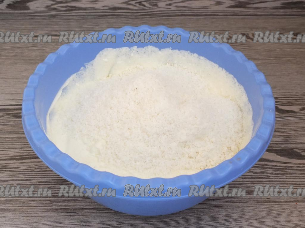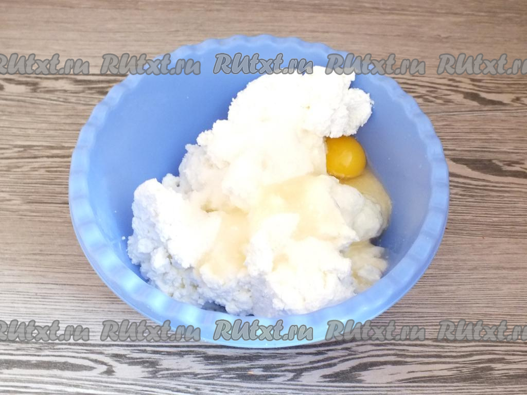 Для приготовления сырников из творога с кокосовой стружкой, возьмите глубокую миску, выложите в неё творог, разбейте 2 яйца, добавьте сахар. Тщательно перемешайте творожную массу ложкой (или воспользуйтесь погружным блендером).
