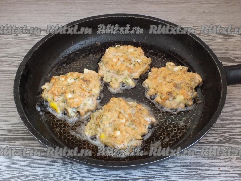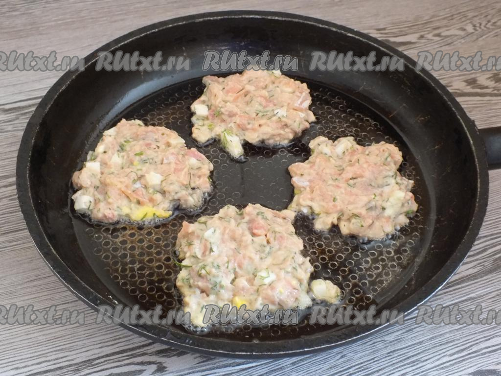 В сковороде разогрейте на умеренном огне 50 мл растительного масла. Зачерпните столовой ложкой фарш, выложите в разогретую сковороду. Таким образом выкладывайте на сковороду фарш, формируя круглые рубленные рыбные котлетки. Обжаривайте котлеты на среднем огне с одной стороны в течение 7 минут (до аппетитной корочки).