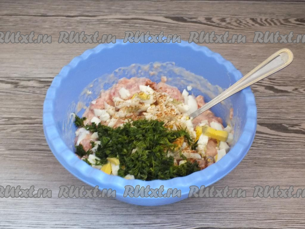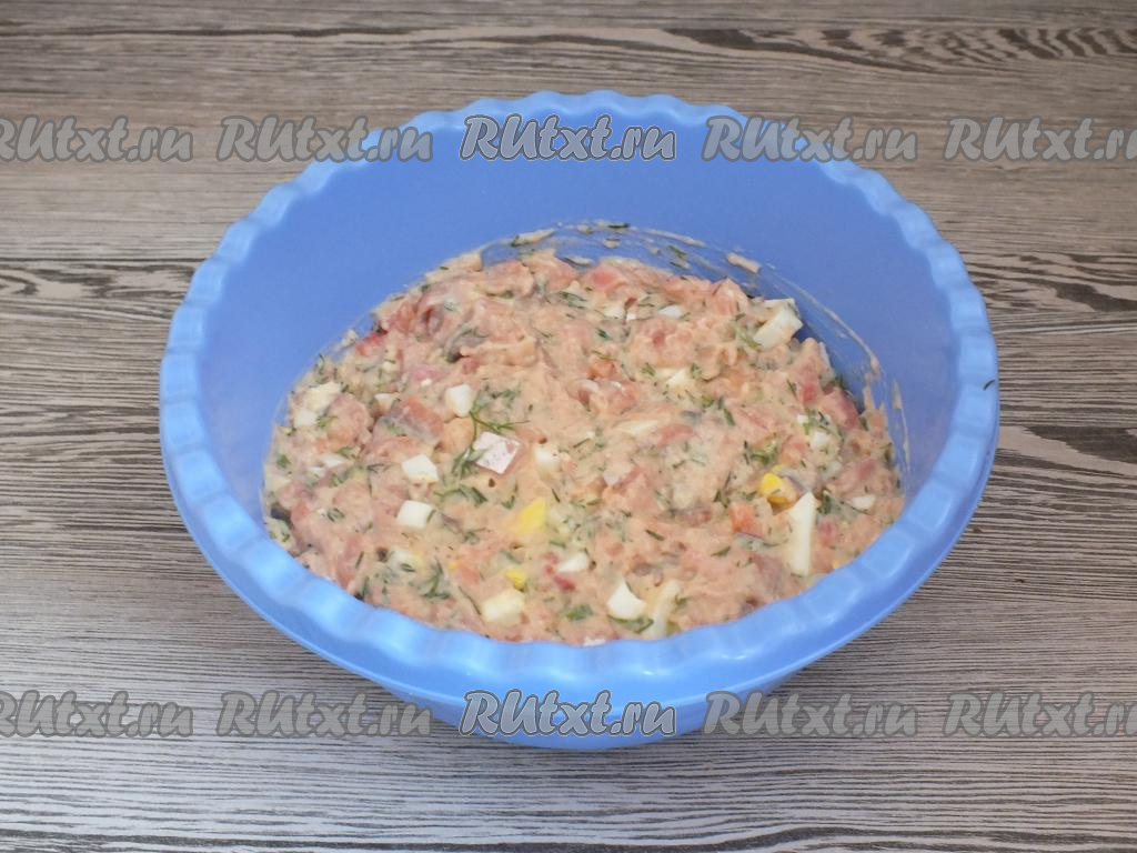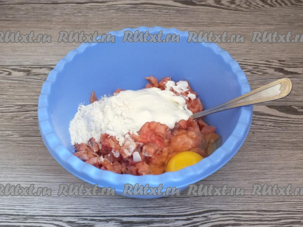 Переложите нарезанное рыбное филе в миску, добавьте к нему специи, соль, сырое яйцо, майонез и муку, перемешайте.