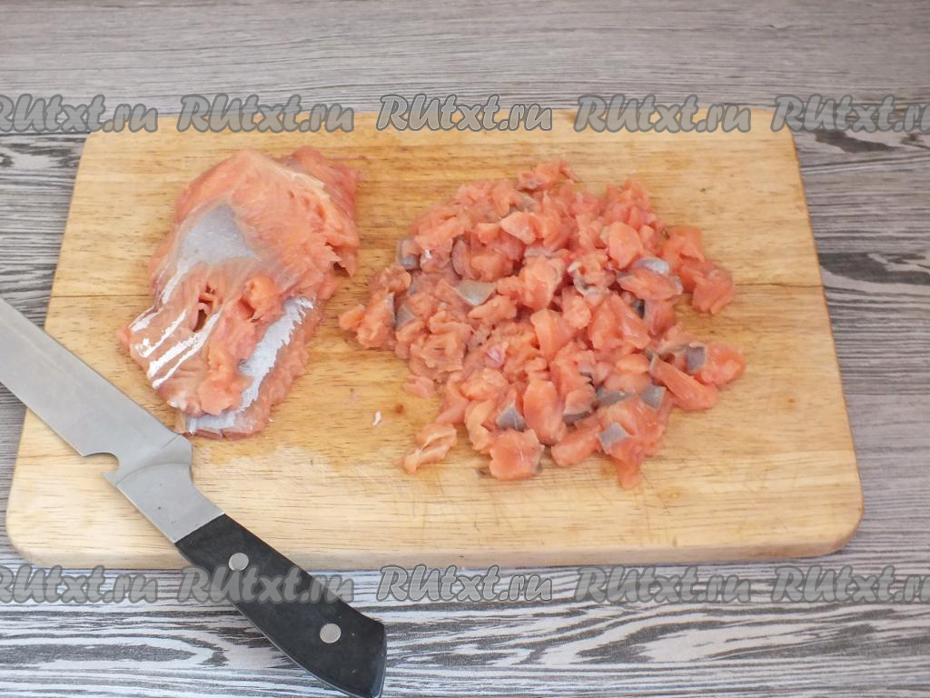 Для приготовления котлет можно купить филе горбуши в магазине. А можно взять целую рыбу и разделать её на филе, для этого необходимо разрезать тушку вдоль хребта и брюшка, удалить внутренности и кости, снять кожицу. Филе горбуши нарежьте на мелкие кубики размером, примерно, 1 см на 1 см (можно и помельче).