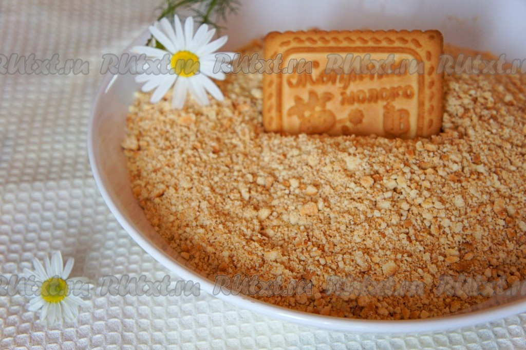 Измельчённое печенье пересыпать в миску, всыпать какао, влить растопленное тёплое сливочное масло, сразу же перемешать до однородности и основа для коржа готова.