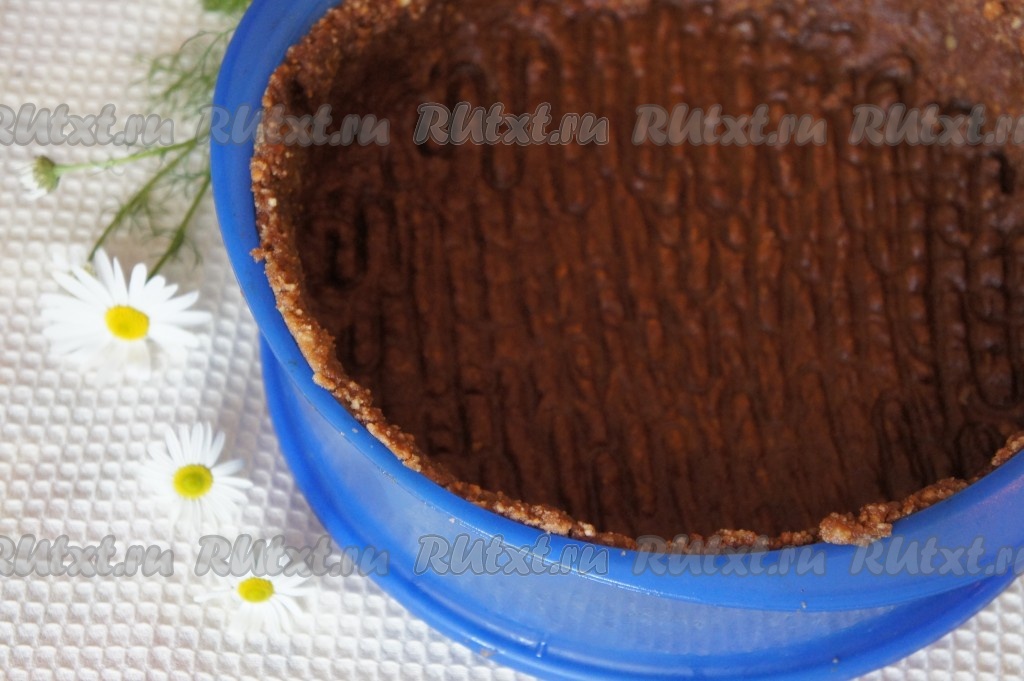 Распределить основу для коржа по дну разъёмной формы (я использовала силиконовую разъёмную форму диаметром 23 сантиметра), сформировать бортики, как на фото. Убрать основу чизкейка в холодильник на 15 минут. Тем временем, взять 15 грамм желатина, всыпать в небольшую ёмкость, влить 5 столовых ложек холодной кипячёной воды, перемешать и оставить набухать на 15-20 минут.