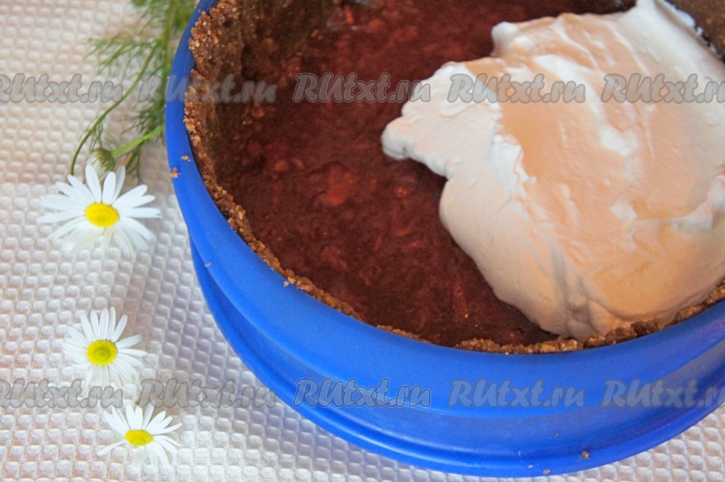 Прогретый желатин немного охладить, добавить его во взбитые сливки, перемешать миксером и сливочный слой чизкейка готов. Выложить сливочный слой поверх песочной основы, разровнять ложкой и отправить на 20 минут в холодильник.