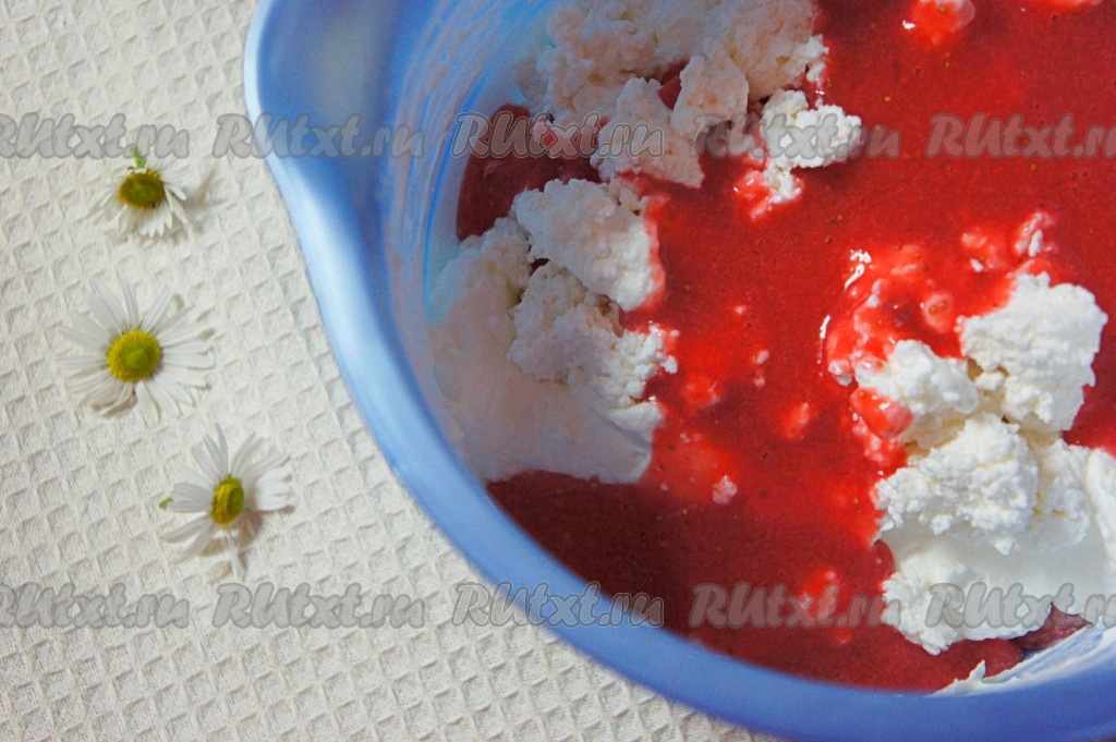 Теперь приступим к приготовлению творожно-клубничного слоя. Клубнику можно брать как свежую, так и замороженную. Замороженную клубнику нужно будет слегка разморозить, лишнюю жидкость слить. Свежую клубнику нужно будет промыть водой, удаляя чашелистики, обсушить. Переложить подготовленную клубнику в чашу, пробить погружным блендером клубничную массу до однородности. В отдельной ёмкости, в которой будет удобно взбивать миксером, взбить хорошо охлаждённые сливки с сахаром до стойких пиков, затем добавить творог и клубничную массу, взбить миксером творожно-клубничную массу до однородности. Оставшуюся часть набухшего желатина тоже прогреть в микроволновке, не доводя до кипения, немного остудить, добавить в клубнично-творожную массу, перемешать на низкой скорости миксера до однородности. После этого клубнично-творожный слой будет готов.