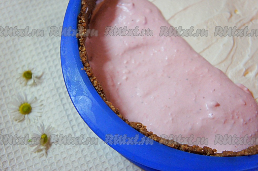 Распределить клубнично-творожный слой поверх застывшего сливочного слоя. Отправить чизкейк, приготовленный с клубникой, сливками и творогом, в холодильник минимум на 2 часа (до полного застывания).