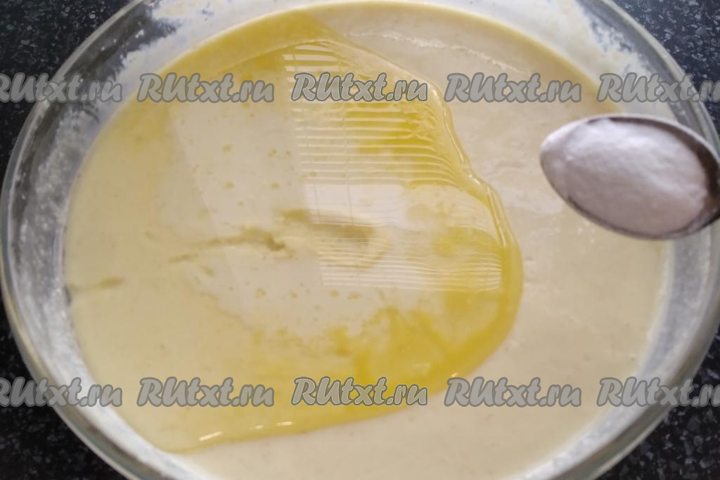 По прошествии минимум 1 часа (время набухания манки) тесто станет гораздо гуще. Добавляем в тесто растопленное и остуженное сливочное масло и подсолнечное рафинированное масло, перемешиваем. Затем добавляем соду, снова перемешиваем тесто.