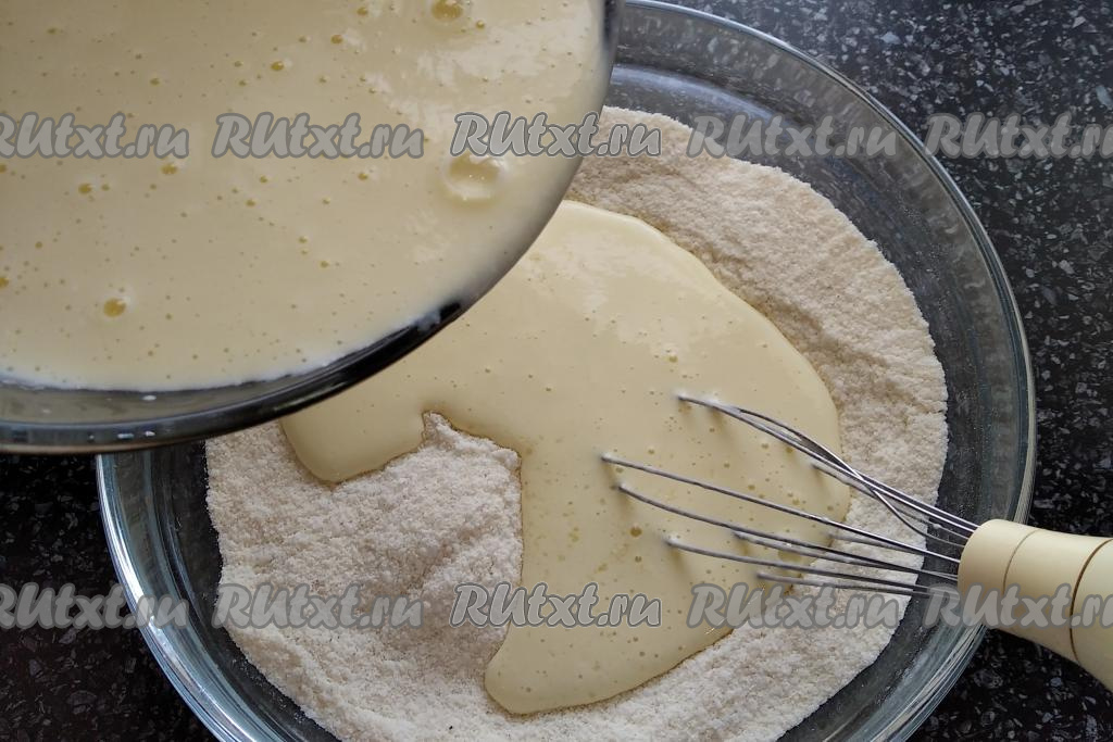 Теперь в тарелку с сухими ингредиентами вливаем приготовленную смесь из жидких ингредиентов, перемешиваем венчиком до однородности. По консистенции тесто сначала (до набухания манки) должно быть похоже на жидкий крем. Накрываем тарелку с тестом крышкой и оставляем минимум на 1 час (можно и на 2 часа), для того чтобы манная крупа набухла.