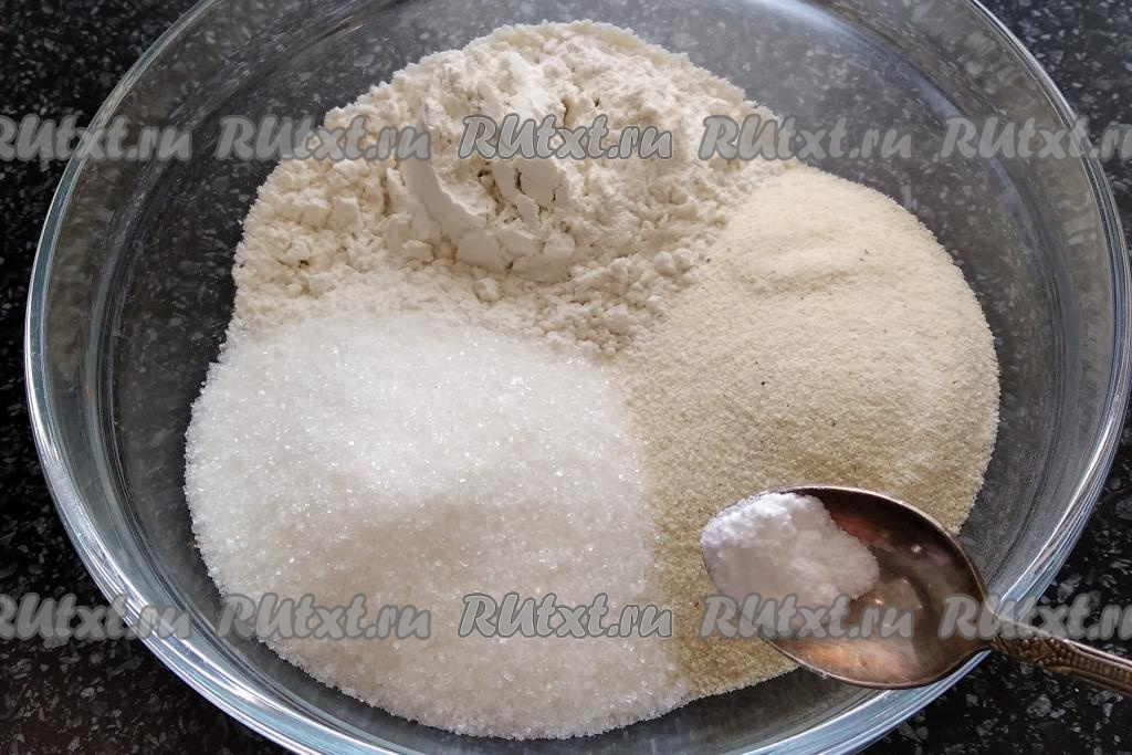 Смешиваем сухие ингредиенты, для этого в глубокую тарелку (в ней затем оставим набухать тесто) засыпаем манную крупу, сахар, просеянную муку и ванилин.