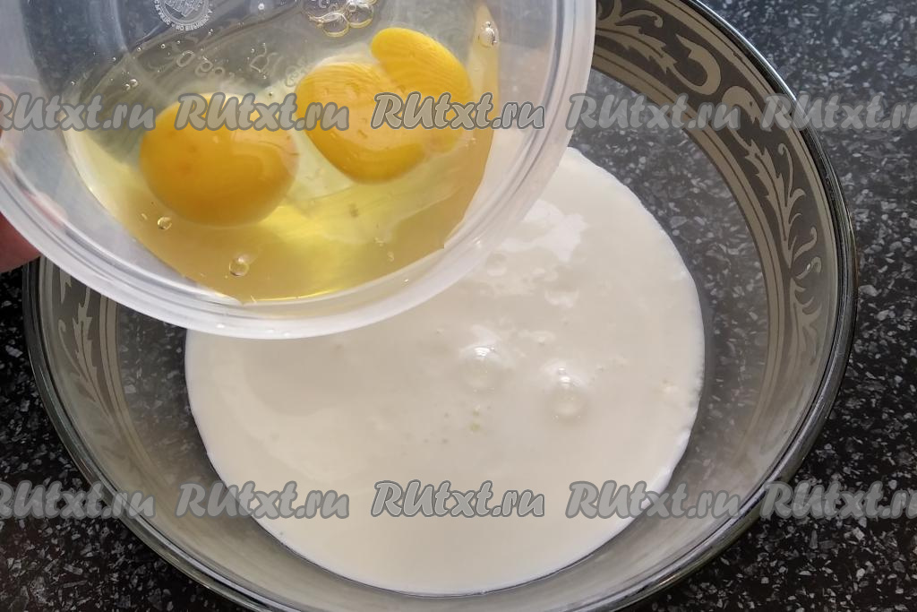 В другой глубокой тарелке смешиваем жидкие ингредиенты: кефир, майонез, сырые яйца. Просто перемешиваем хорошо венчиком, взбивать не нужно.