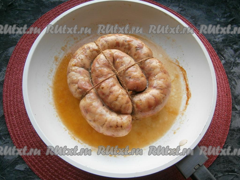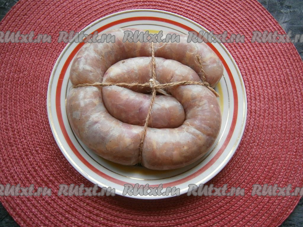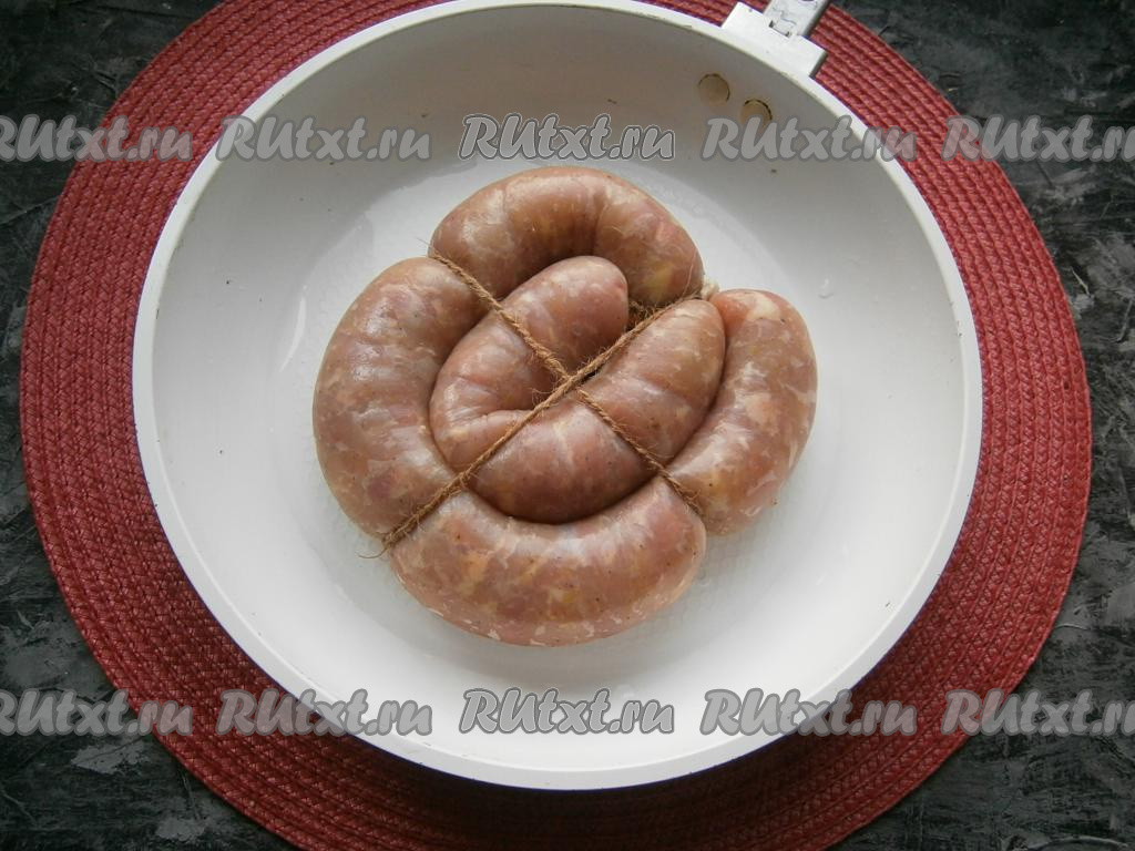 Наполнить кишки фаршем не очень плотно (можно наполнить кишки фаршем с помощью специальной насадки для мясорубки или же использовать верхнюю часть пластиковой полутора литровой бутылки с горлышком), затем концы кишки тщательно перевязать с двух сторон. Для удобства колбасу скрутить улиткой и перевязать шпагатом. Наколоть колбасу в нескольких местах иголкой.