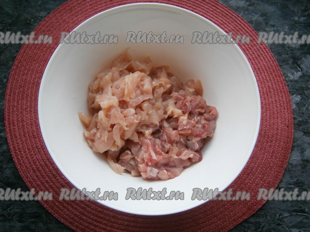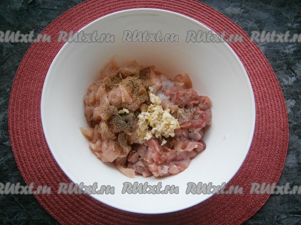 К нарезанному куриному мясу добавить соль, кориандр, мускатный орех, белый и чёрный молотые перцы, а также пропущенный через пресс чеснок.