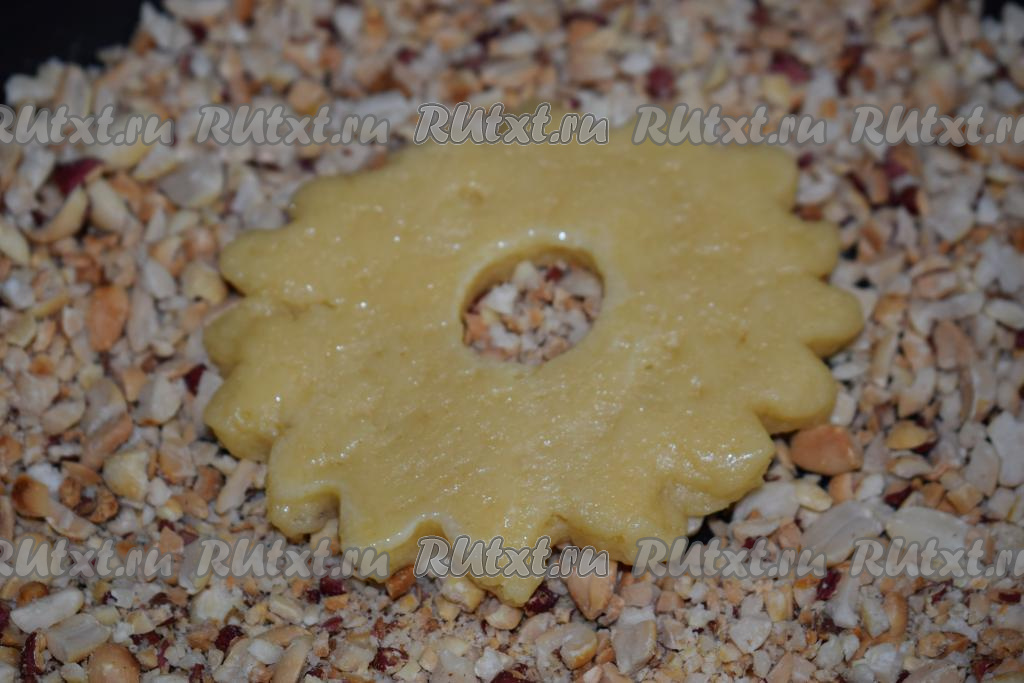 Далее берем каждое кольцо в ладошку и стороной, смазанной яйцом, обмакиваем в дроблёный арахис, слегка вдавливая тесто в орехи.
