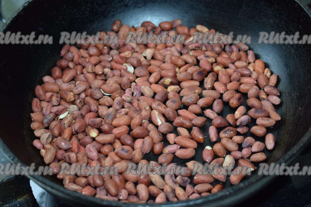 Арахис поджариваем на сухой сковороде на среднем огне, помешивая, в течение 2-3 минут.