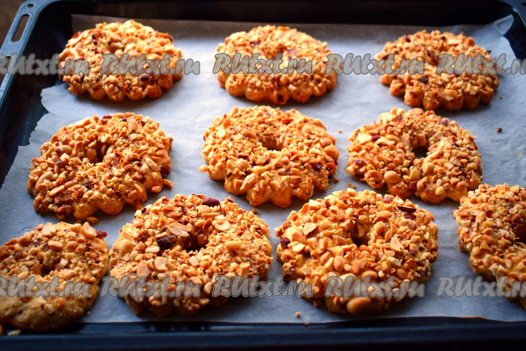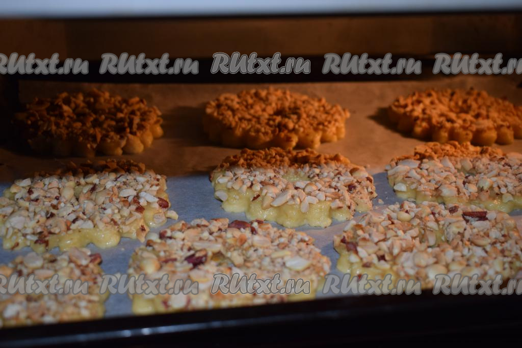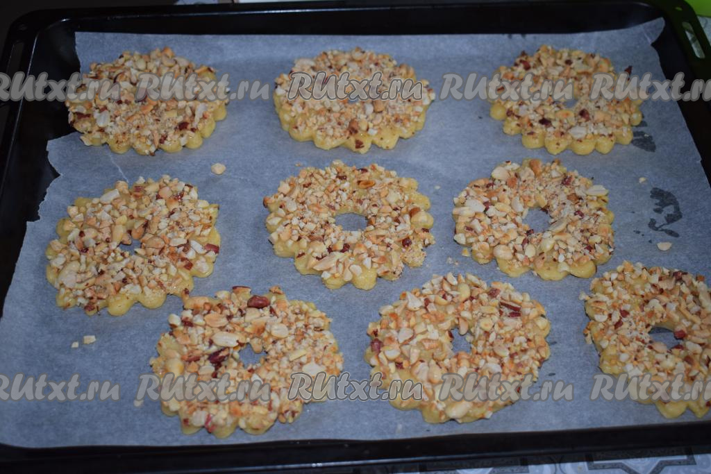 Подготовленные песочные кольца с арахисом кладём на противень, застеленный пергаментом.