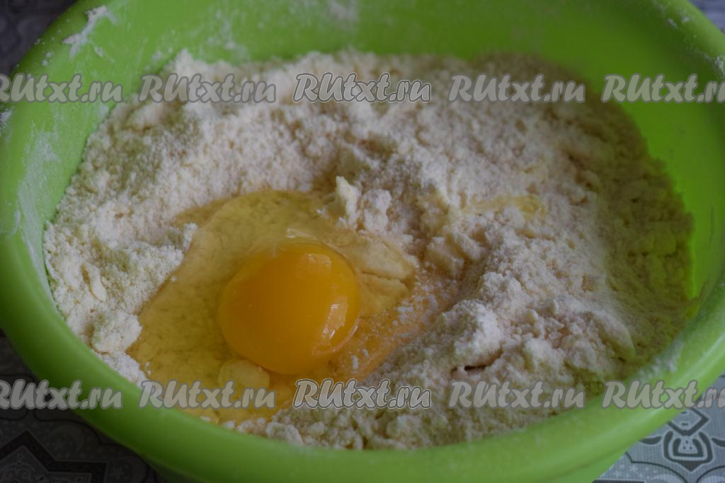 К крошке добавляем яйцо и сметану, начинаем вначале ложкой, а затем руками замешивать тесто.