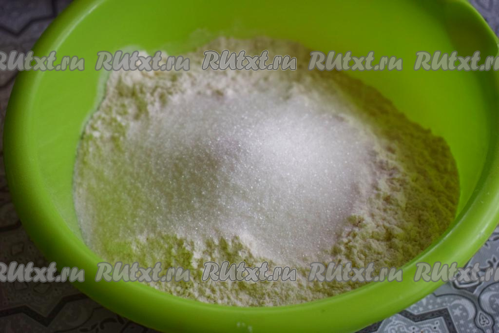 Для того чтобы замесить тесто, соединим в глубокой миске муку, соль и сахар.