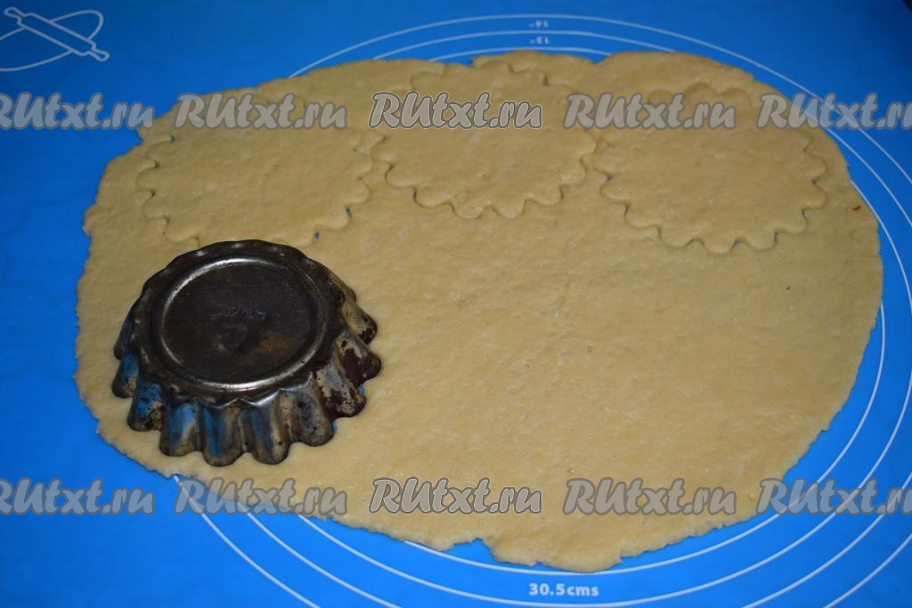 Охлаждённое тесто раскатываем в пласт толщиной около 7-8 мм и формочкой для кексов (или стаканом) вырезаем кружочки. Диаметр моей формочки, приблизительно, 12 см. Выход с таким диаметром 15 штук.