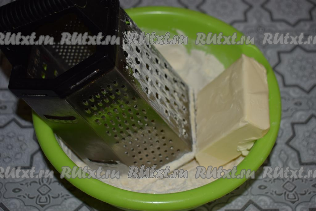 Далее руками втираем масло в мучную смесь до образования лёгкой крошки.