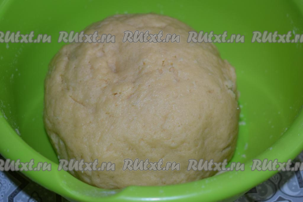 Тесто по консистенции получается плотным, оно не липнет к рукам и прекрасно держит форму. Миску с тестом, накрыв плёнкой, отправляем на 30 минут в холодильник.